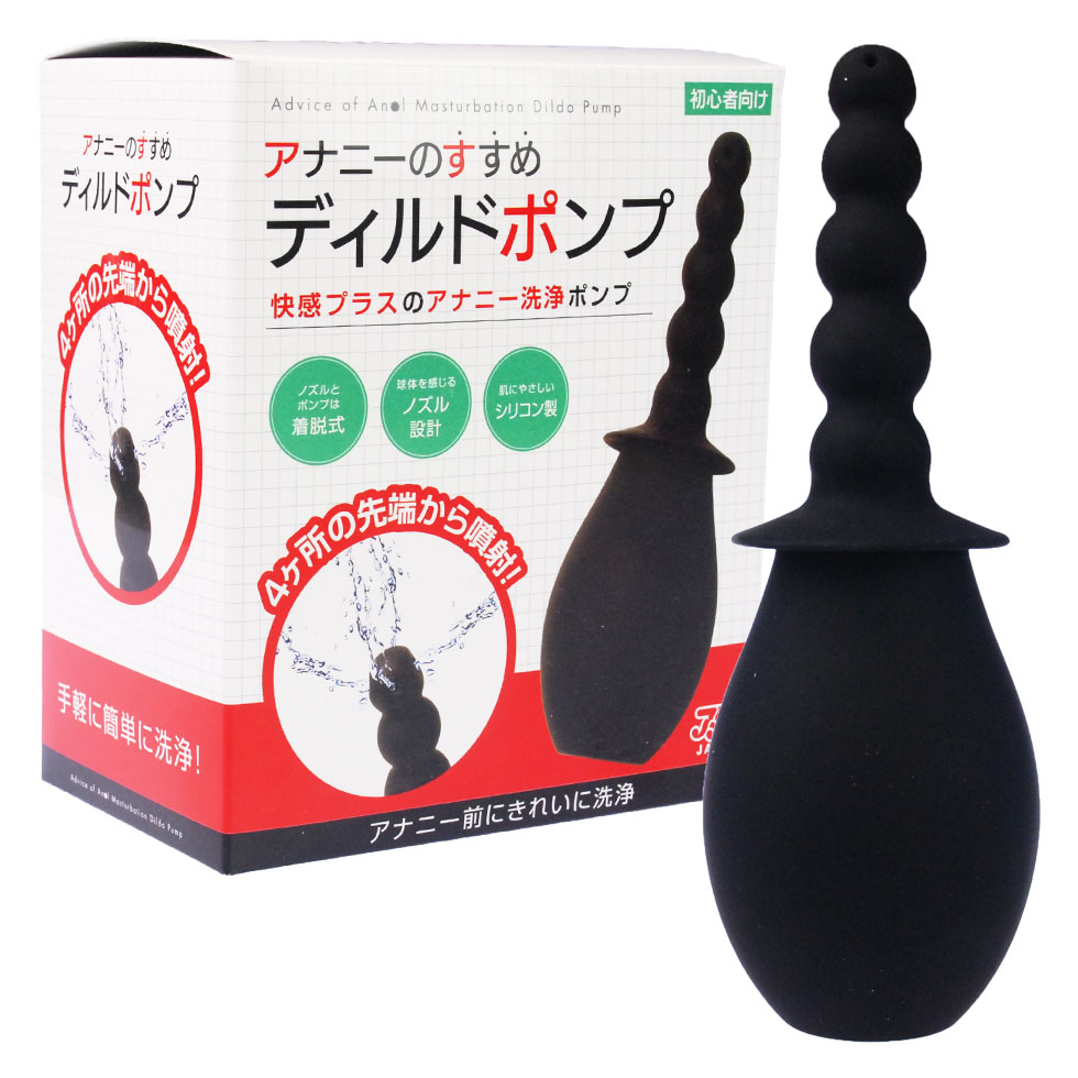 男性のアナニーや、前立腺マッサージのプレイ前にあると便利なのがアナル洗浄ポンプです。アナニーのすすめディルドポンプは、ポンプ内に水やぬるま湯を注いで使用すると、ディルド先から4方向に水が排出されます。腸内をぬるま湯で綺麗に洗浄しながら、ぽこぽこと縊れているディルド部分を挿入して、そのままアナニーが可能です。使い捨ての洗浄ポンプではないので、洗って繰り返し使用してもOKです。