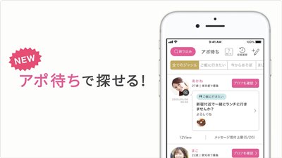 アポ待ちはユーザーの募集の投稿を閲覧する事が出来るコンテンツです。相手が希望する出会い方によって「ご飯に行きたい」「今からあそぼ」「まじめな出会い」「楽しくしゃべろう」「同じ趣味募集」の5つと全ジャンルをまとめて閲覧出来る「全てのジャンル」の合計6つに分けられています。
